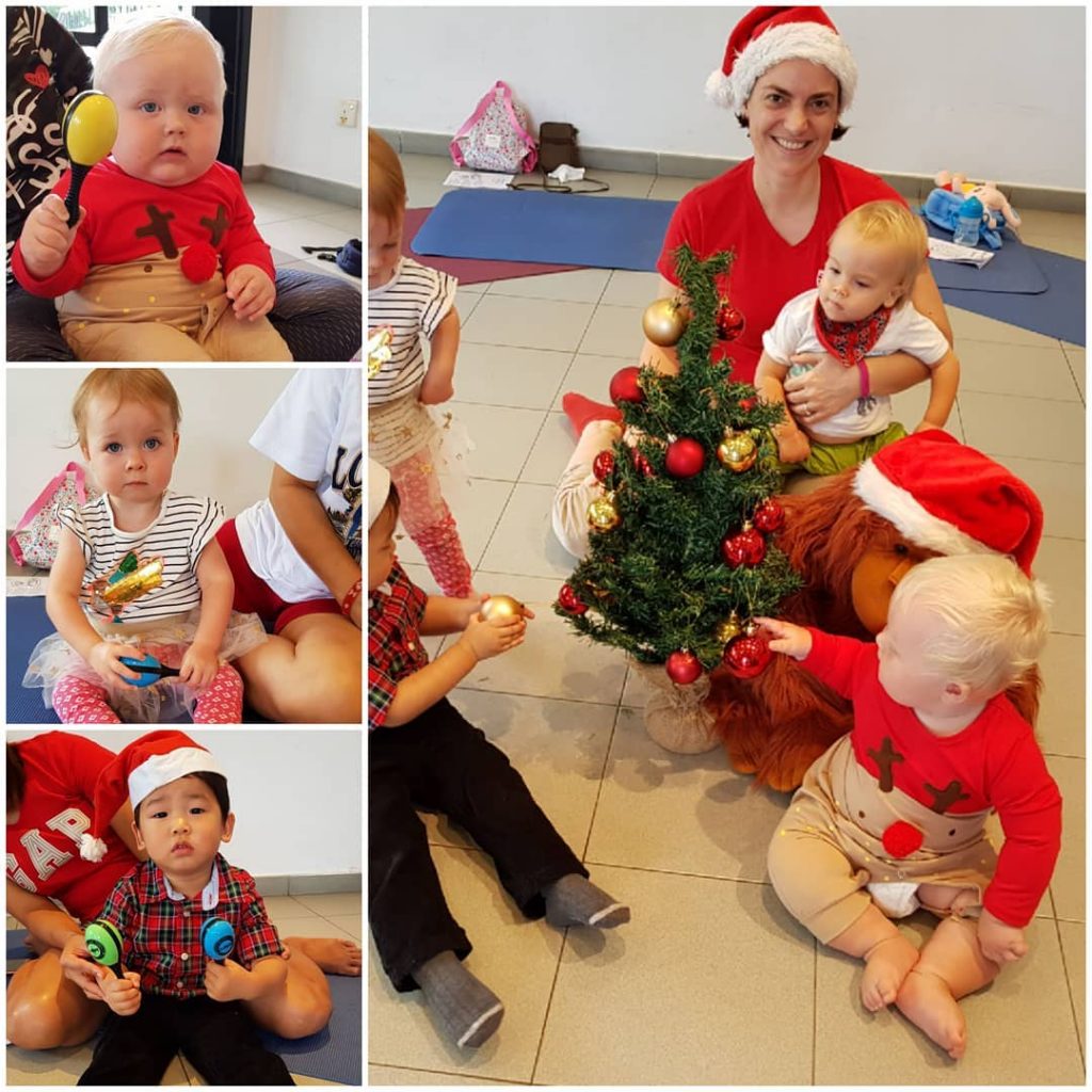 Christmas songs, Christmas carols, winter songs, songs about Santa Claus, snow, and baby Jesus to sing along with action, hand puppets, fingerplay, bubbles, percussion instruments, and guitar.